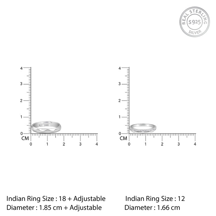 These silver couple bands feature a male band with a wavy design and a female band studded with zircons.