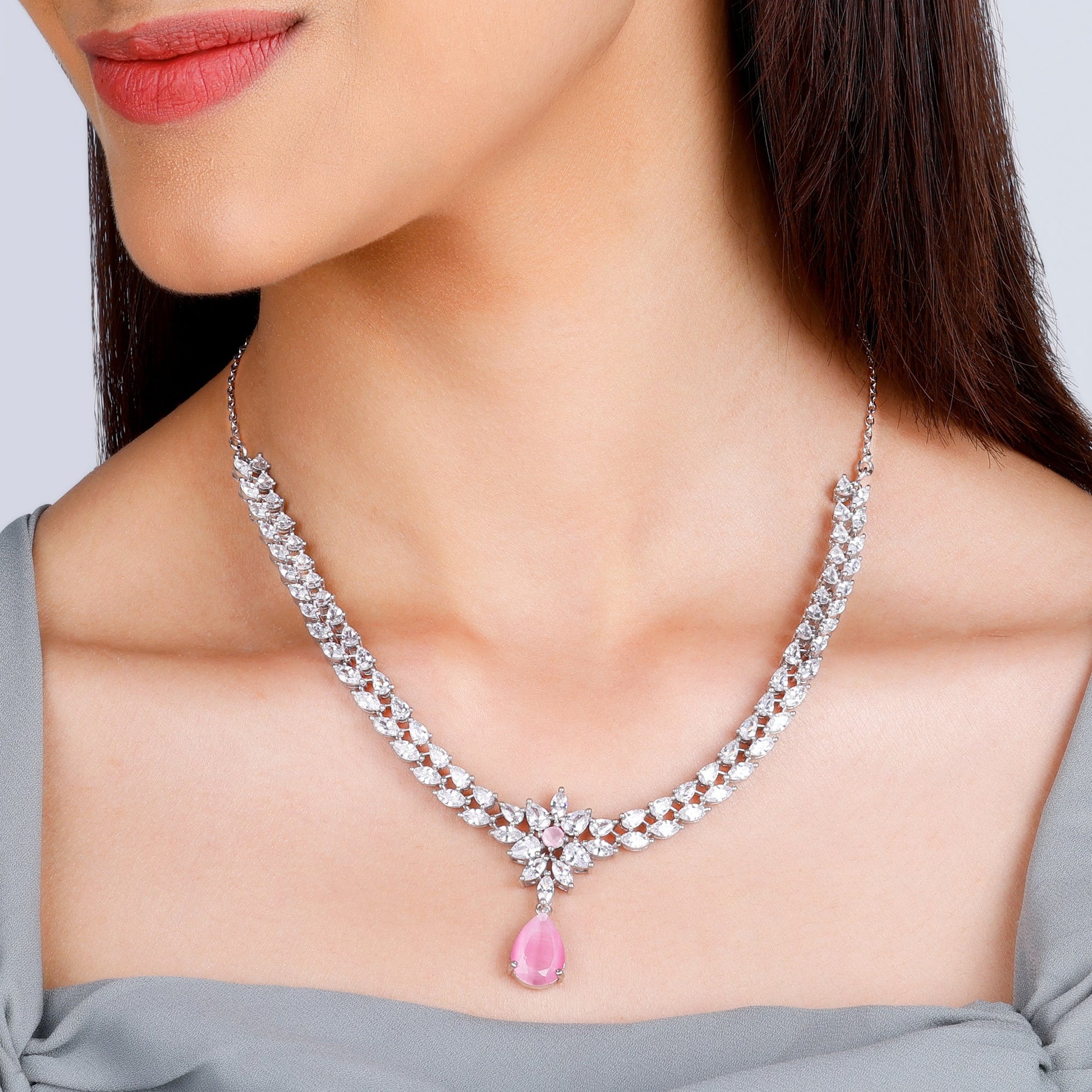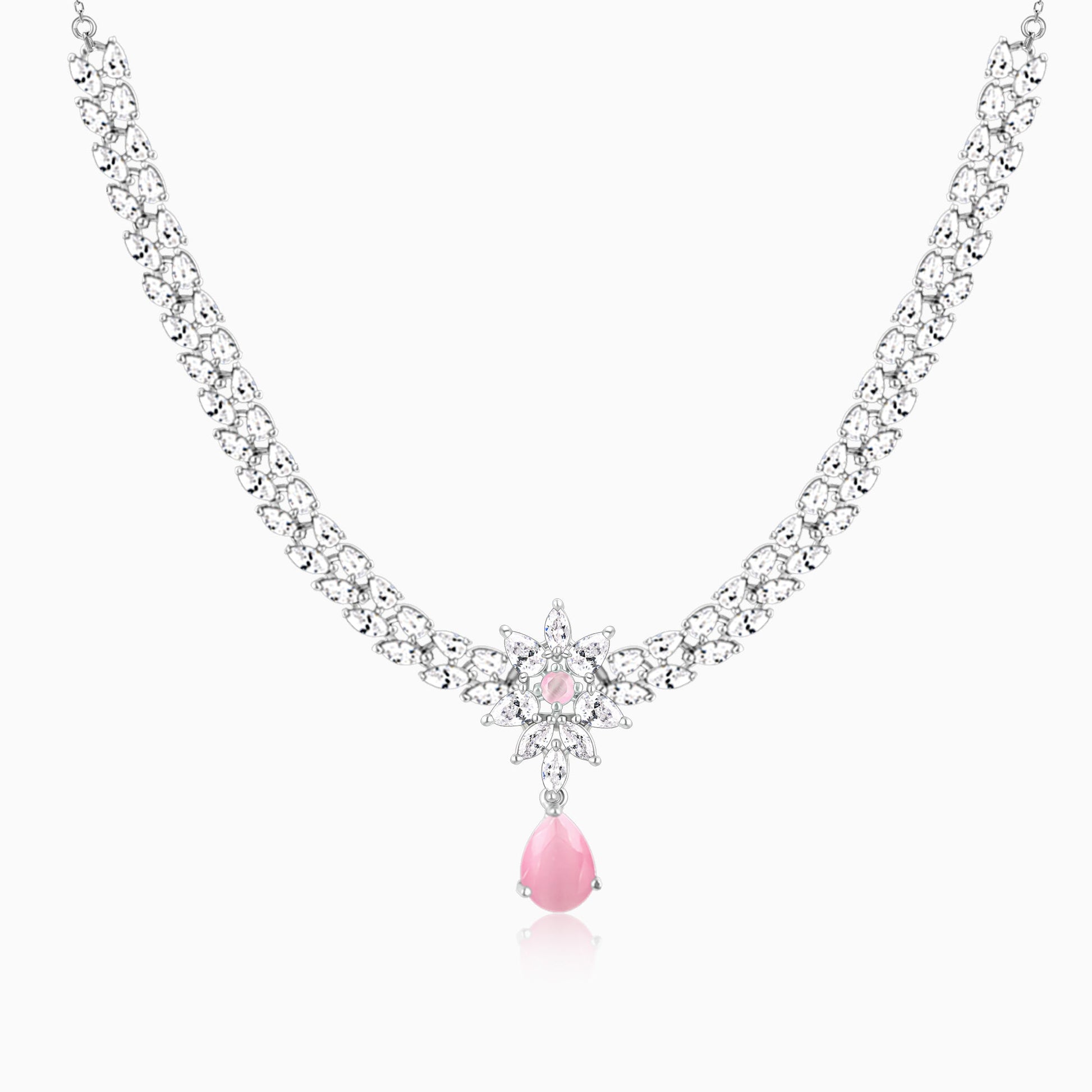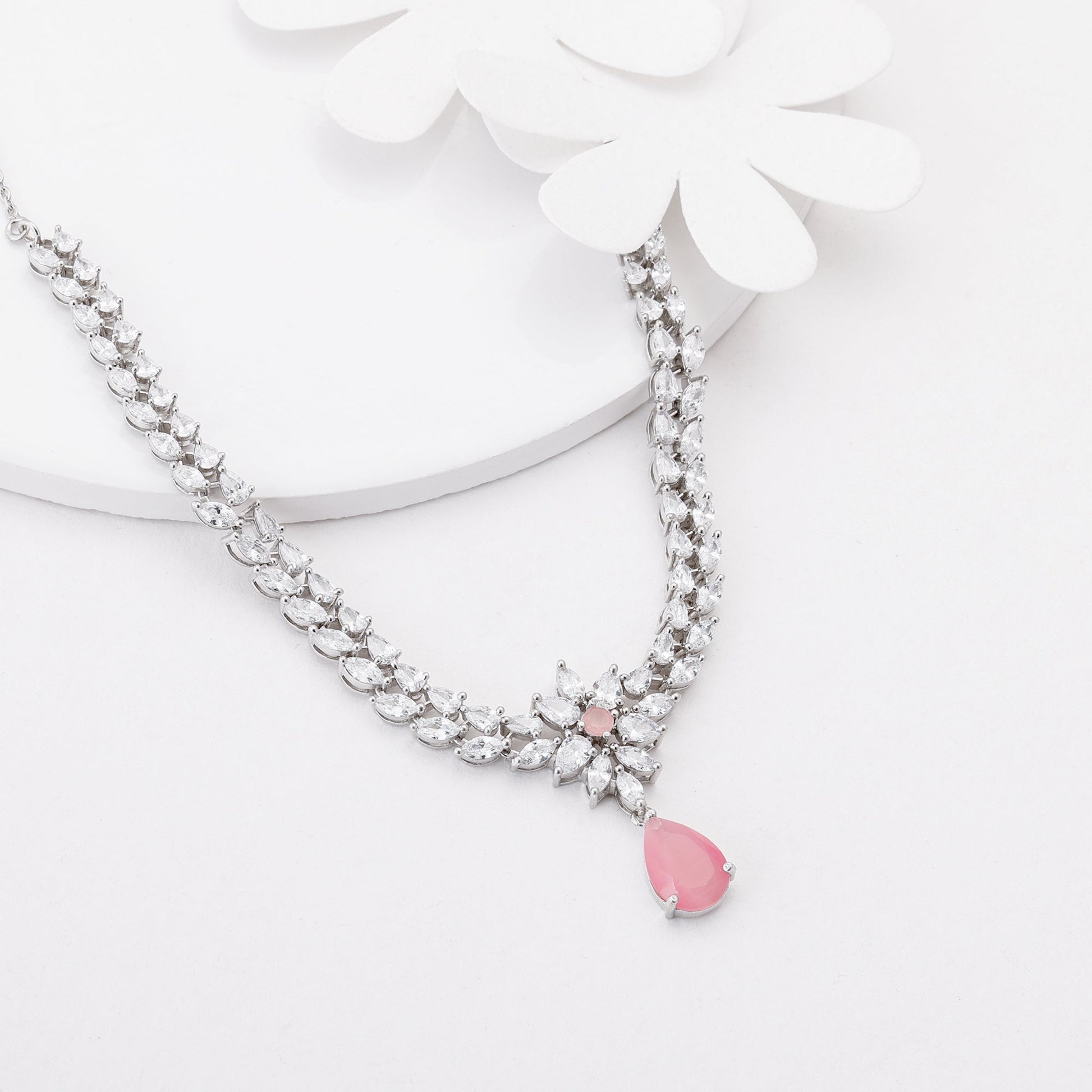 This beautiful necklace features a gorgeous flower studded with zircons and a pink droplet.