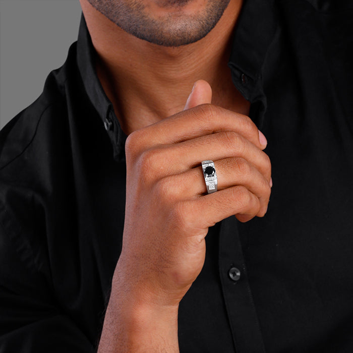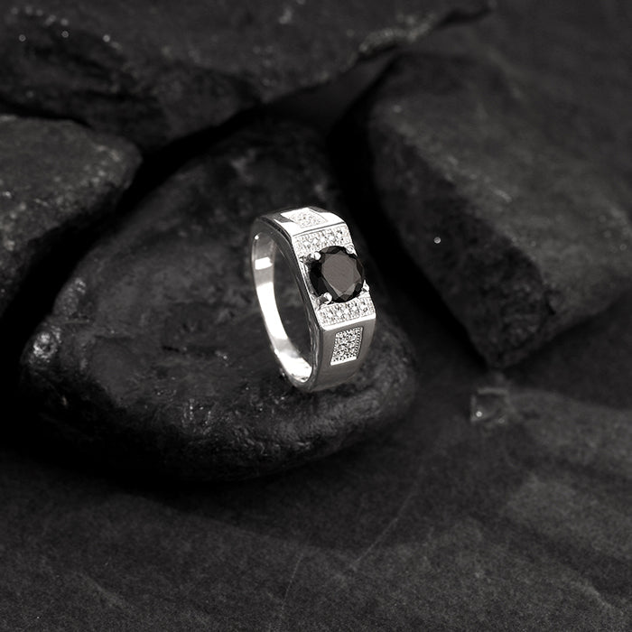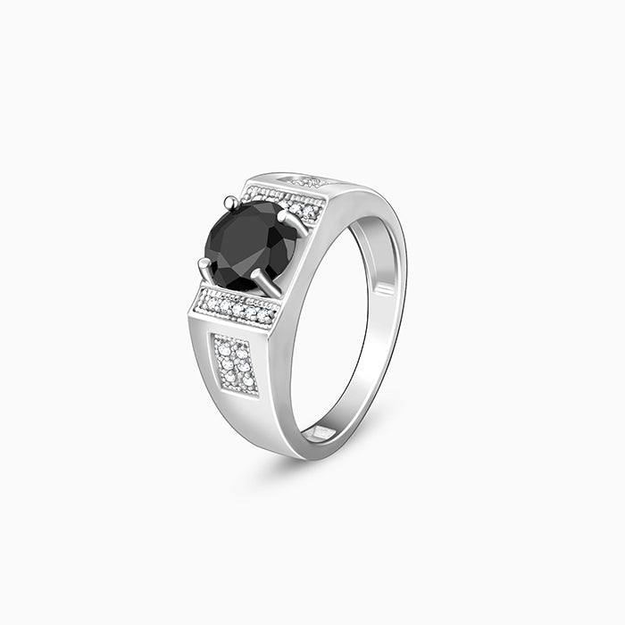 This silver mens ring features a rectangular black stone with zircon accents. The band also has zircon-studded strips on the sides.