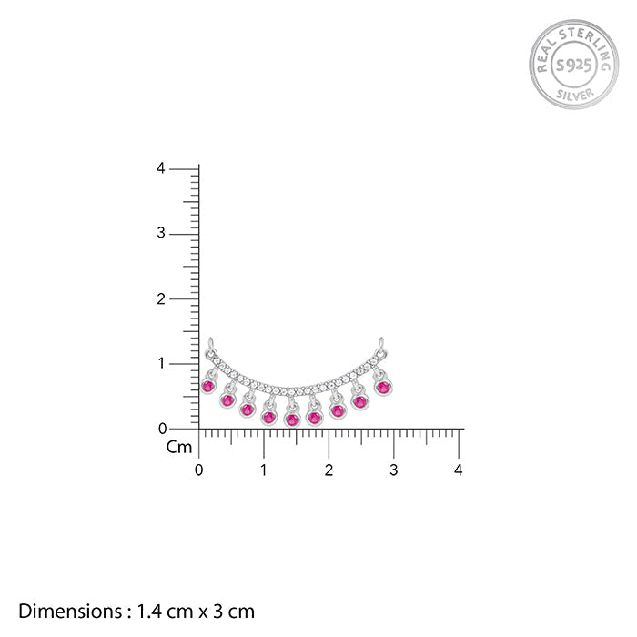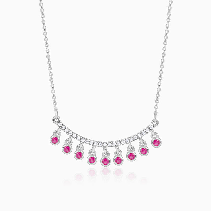 This silver necklace for women features a curved central piece with a pave setting studded with zircons. Pink-coloured circular stones dangling below.