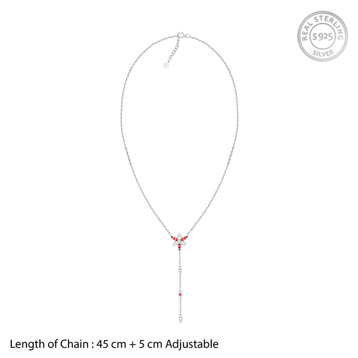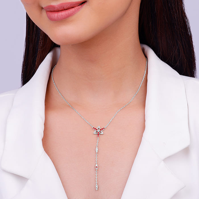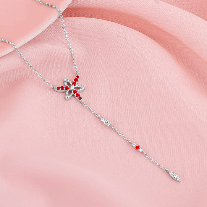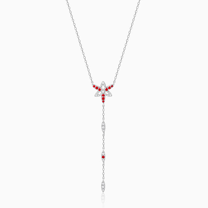 This lariat-type silver necklace features a zircon studded three-petal motif juxtaposed with three spokes studded with red stones. Celebrate your moments of passion with Trendy Freak’s Red Romance Collection.