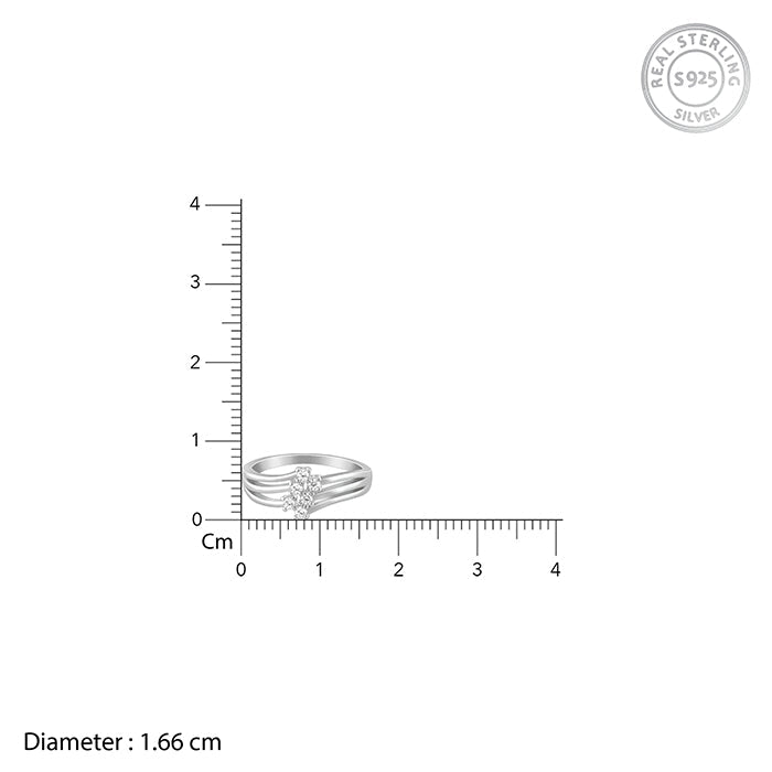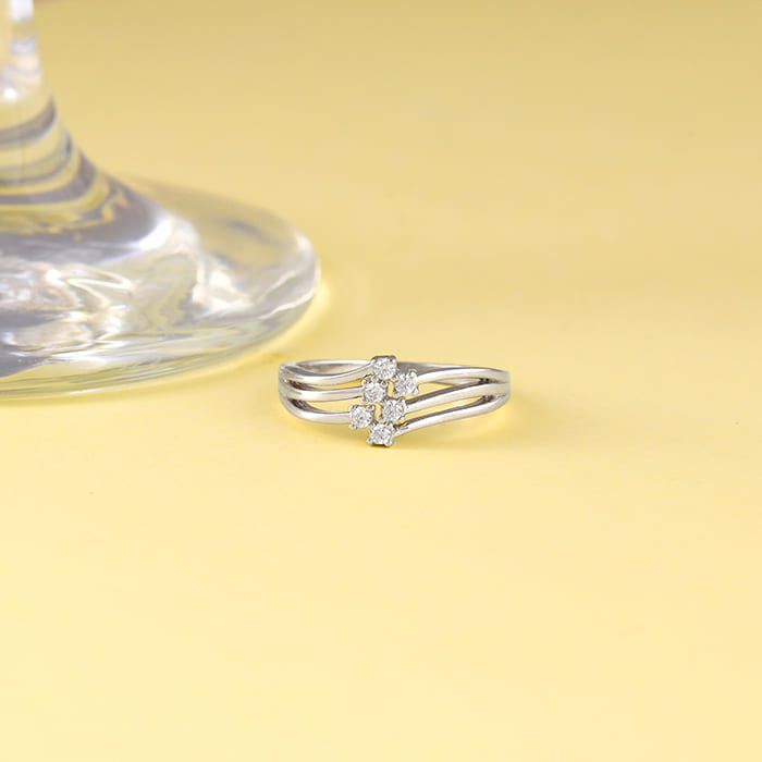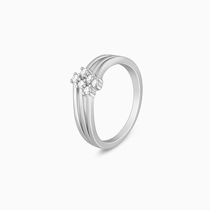 This silver ring features a connection of three lines on both sides with their ends sporting zircons.