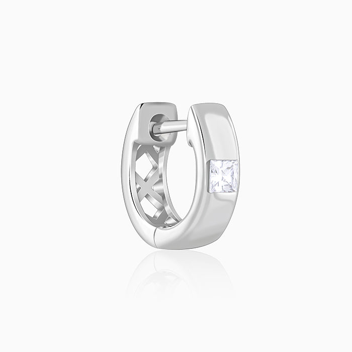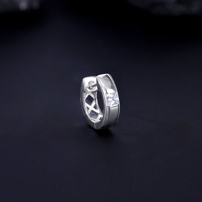 These silver hoop earrings for men feature a zircon on the front and a bold "X" design at the back. The cutout formed by the "X" adds a distinctive and striking detail to the piece.