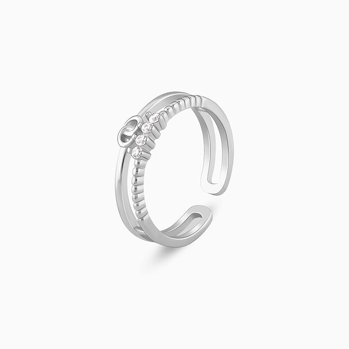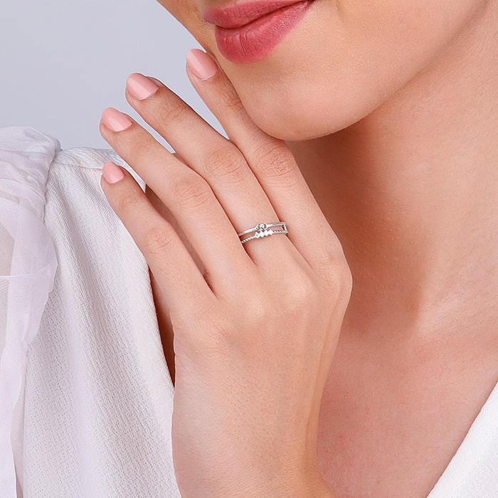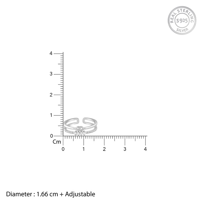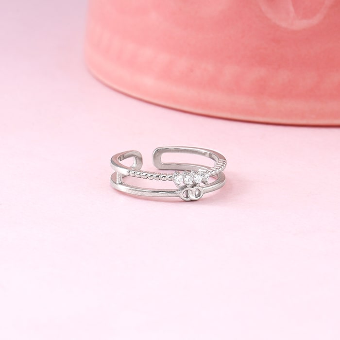 This silver ring features two layers, with an interlocked design on the top layer and well-spaced zircons on the second layer.