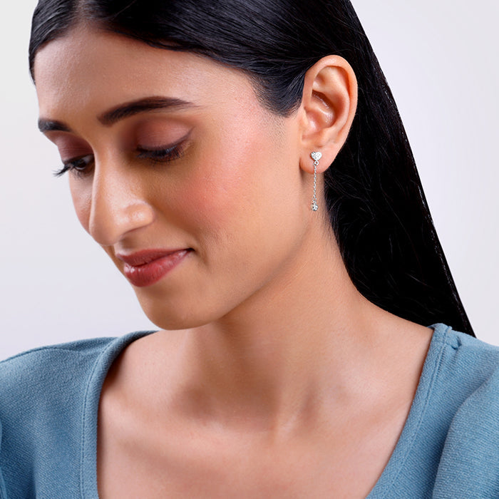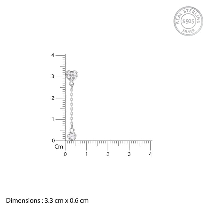 These silver earrings for women feature a heart motif studded with zircon. The heart is connected to a link chain. A bezel-set zircon dangles gracefully at the end, adding movement and sparkle.