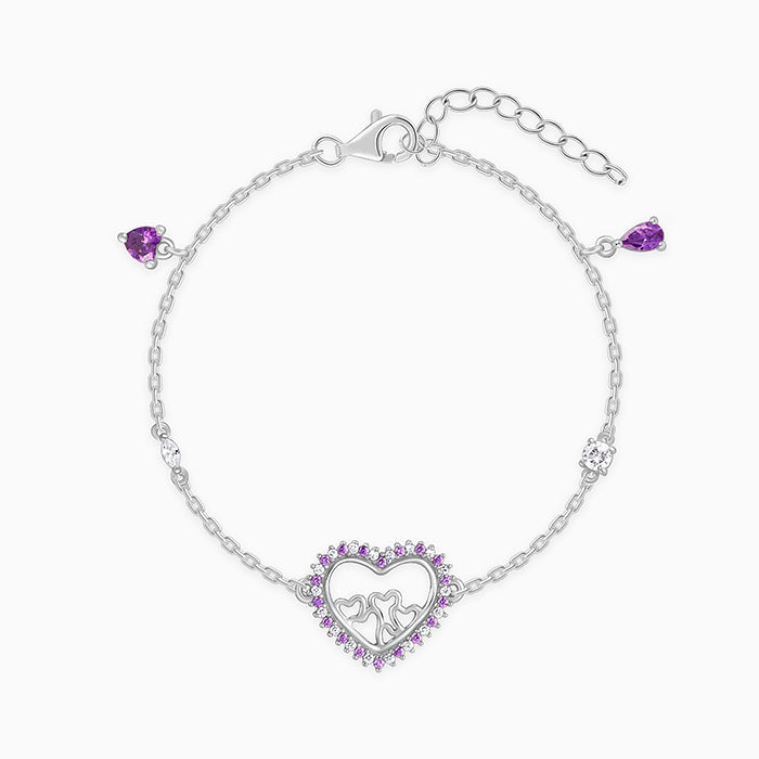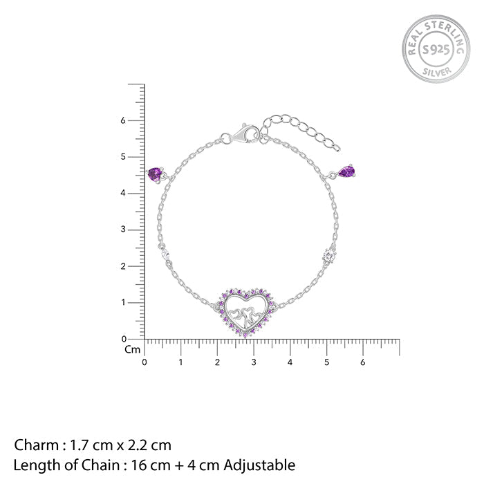 This silver bracelet for women features a central heart-shaped motif, intricately set with zircons and showcasing a cut-out silhouette design within. The chain is further accented by two teardrop-shaped coloured stones, completing its charming aesthetic.