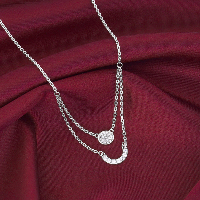 This silver layered necklace features a full moon and crescent moon design in each layer studded with zircons.