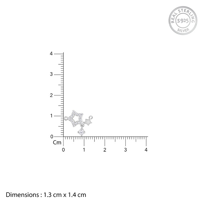This silver necklace for women features two star motifs. The bigger one is hollowed out and is studded with zircons, while the smaller one is solid. A single round zircon dangles from the centre.