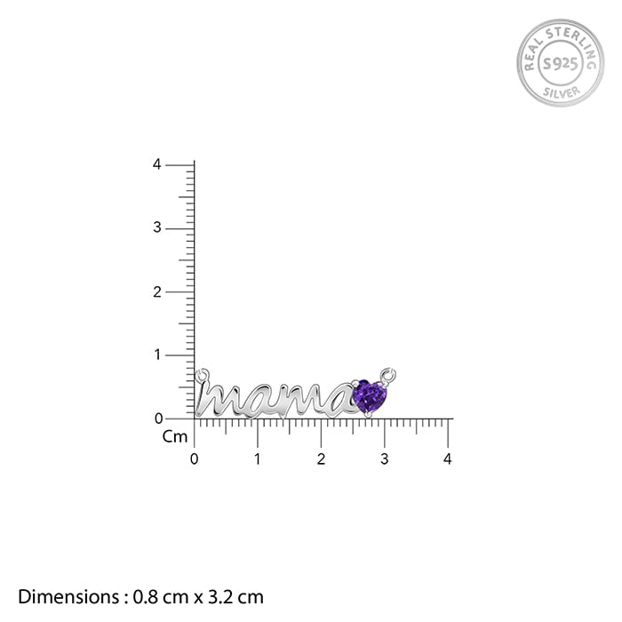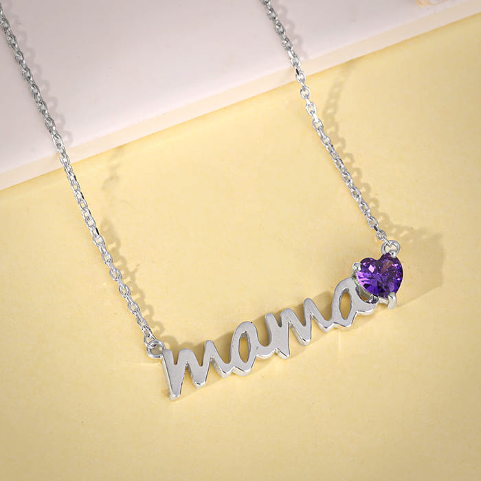 This silver necklace for women features the word "mama" followed by a heart shaped blue coloured stone.