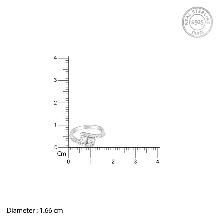 This silver ring features a single band, studded with zircons nestling two square-cut zircons in the centre.