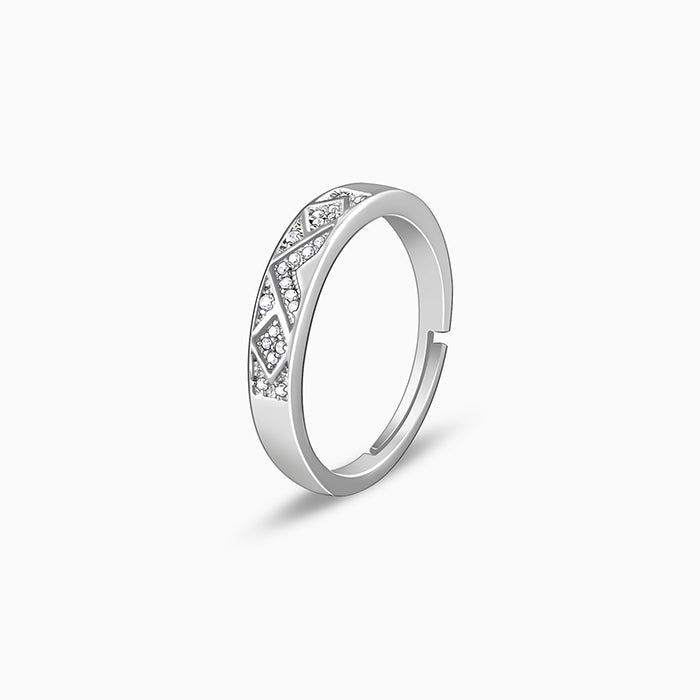 This silver ring features an intricate design with zircons set in geometric patterns interlaced with plain silver at the centre.