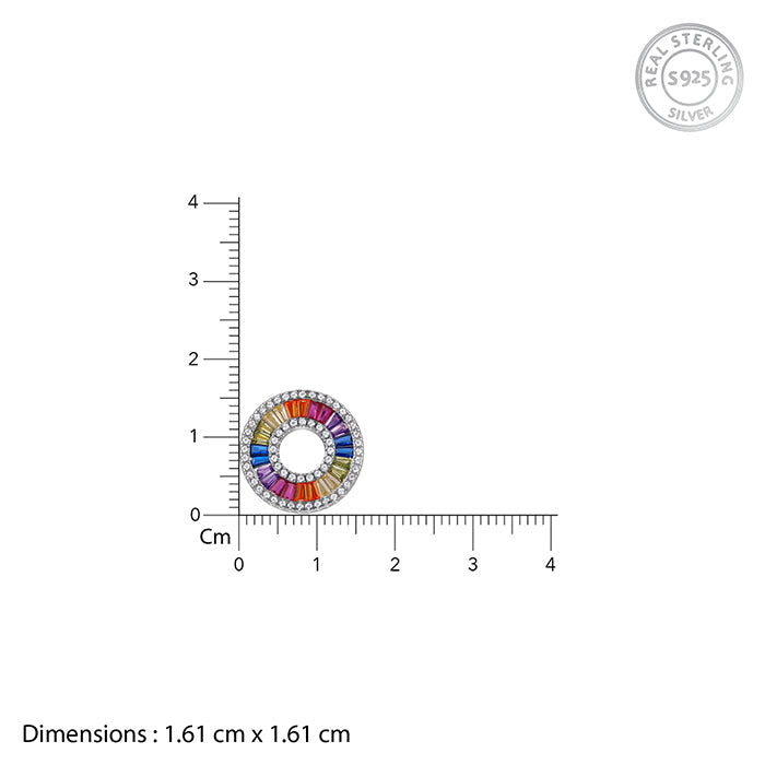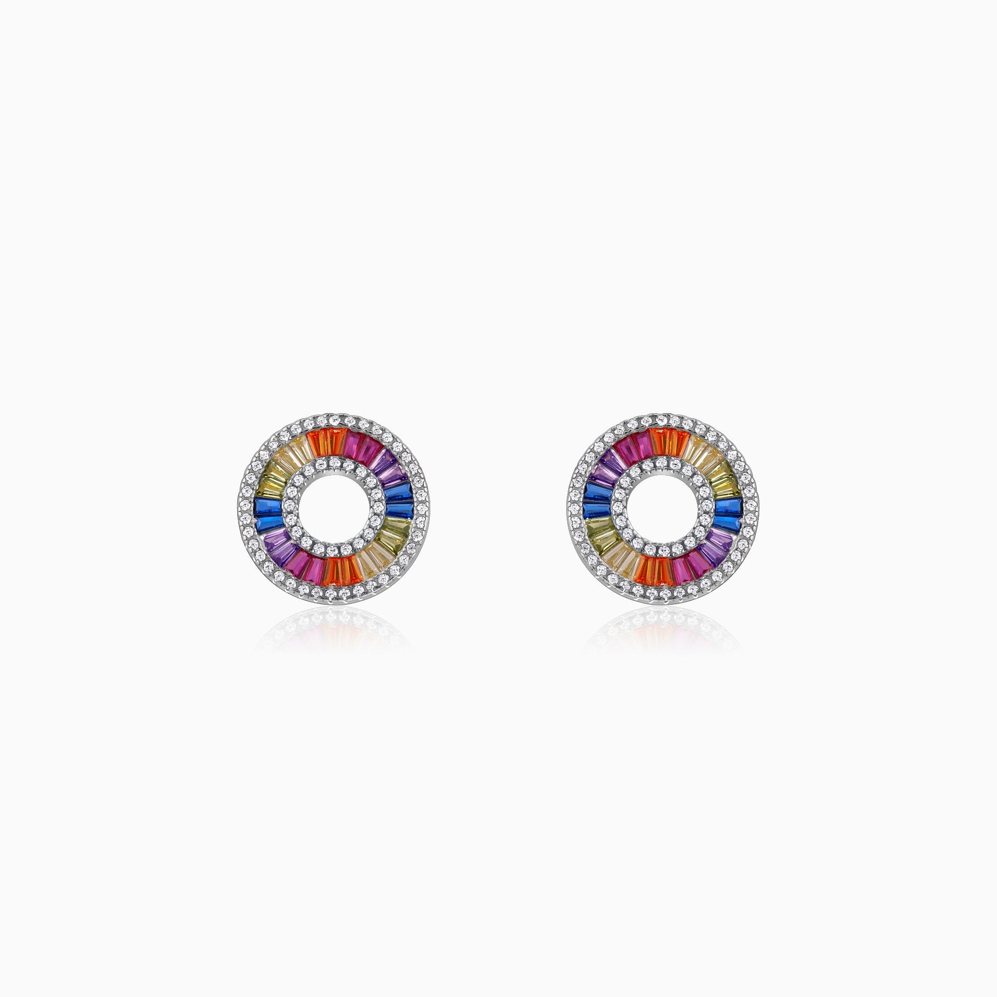 These silver earrings feature a circular design, with the outer layer studded with zircon and the inner layer studded with coloured stones.