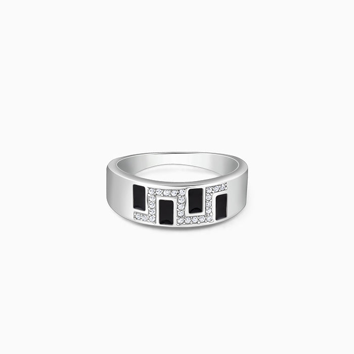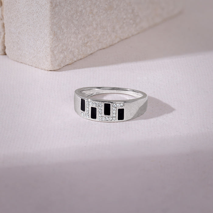 This silver mens ring features a four-rectangular design with black enamel coating. The rectangles are surrounded by zircons.