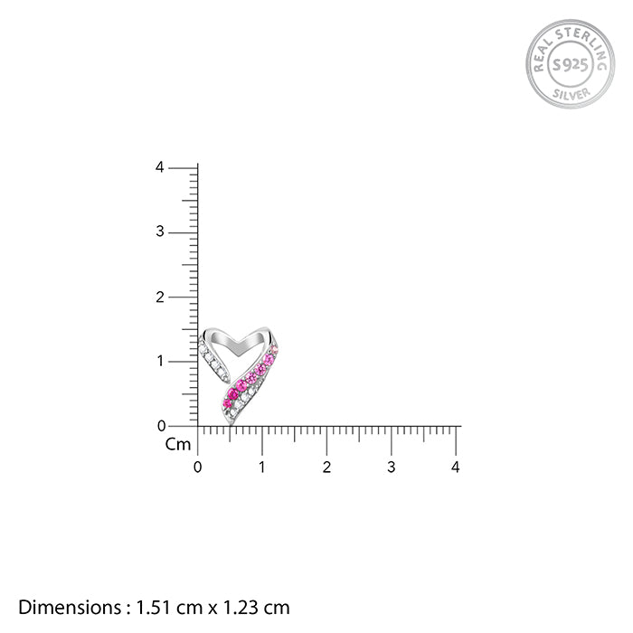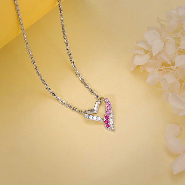 This silver necklace for women showcases a curved, open-heart design, set with alternating rows of pink and zircon stones, creating a dynamic, wing-like effect.