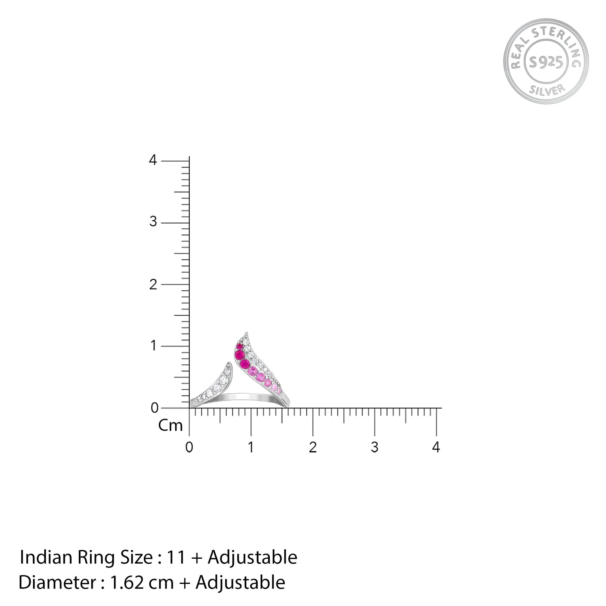 This silver ring for women showcases a curved, open-heart design, set with alternating rows of pink and zircon stones, creating a dynamic, wing-like effect.