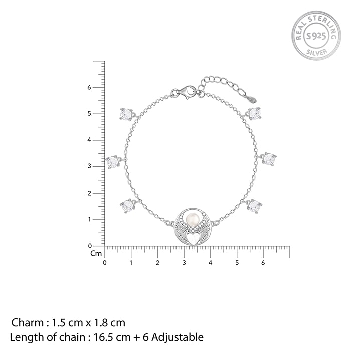 This silver bracelet features a filigree design with a round motif and a pearl placed at the top. Zircons are set below the pearl. A heart motif is inside the circle. Three square zircons dot each side of the bracelet.