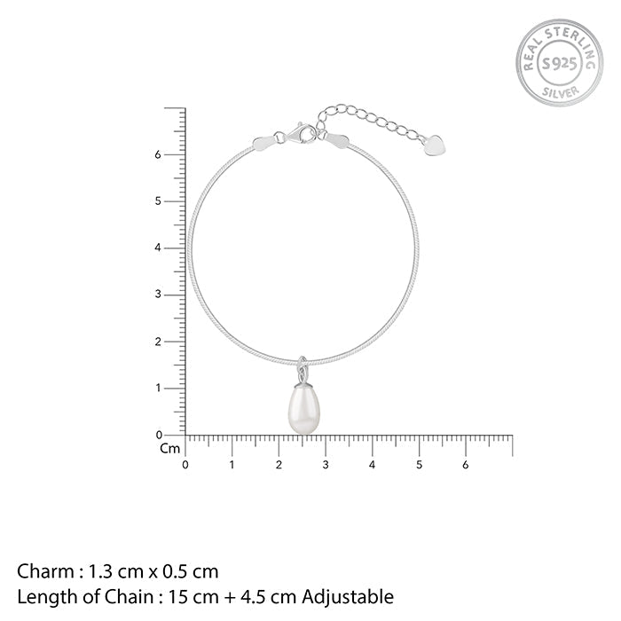 This silver bracelet for women has a drop-shape pearl dangling in the centre.