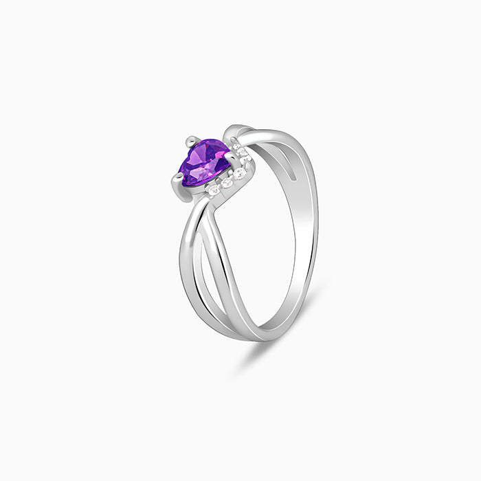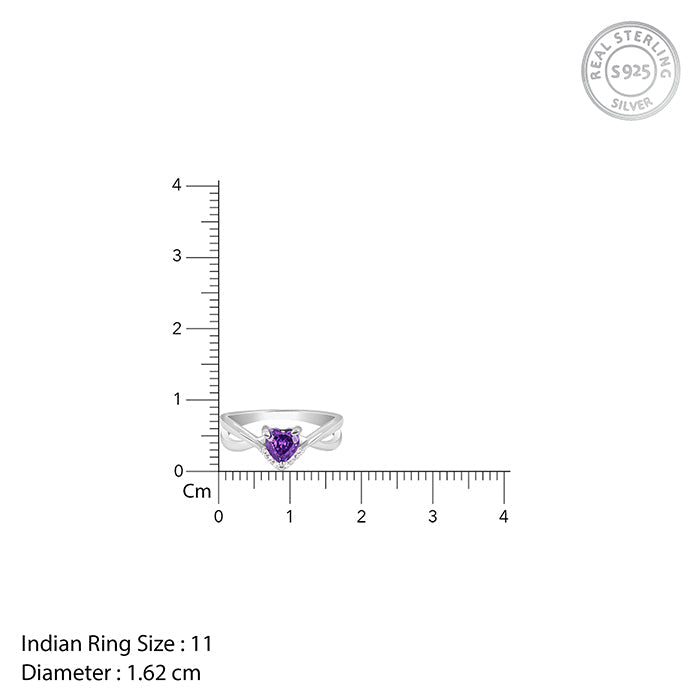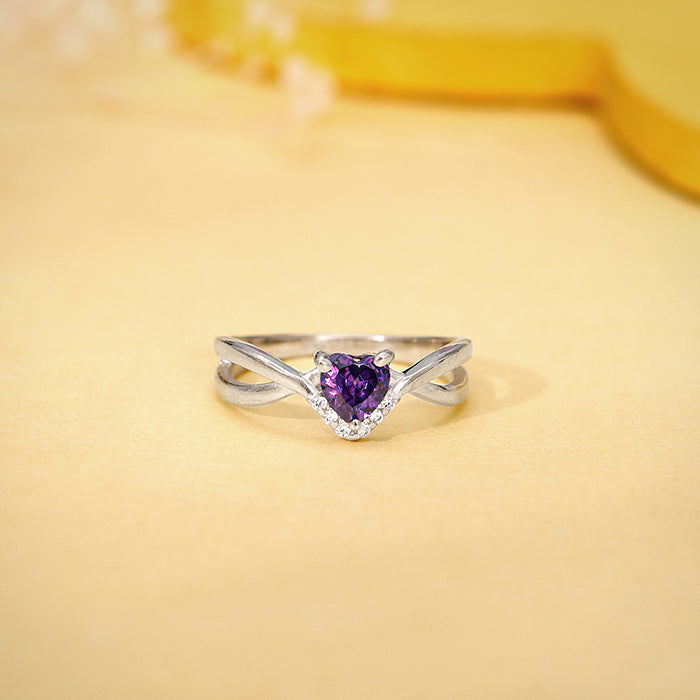 This silver ring for women features a faceted coloured heart-shaped motif, elegantly cradled in a swirl-shaped setting with sparkling zircon accents.
