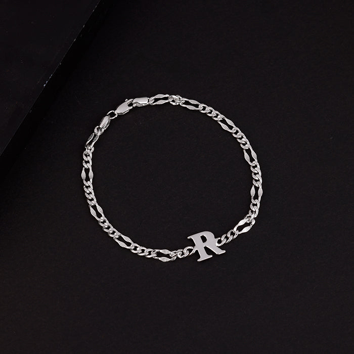 This personalised silver mens bracelet features a classic figaro chain. A prominent, polished gold-plated initial charm is securely integrated, creating a sophisticated and personalised mens bracelet. Its adjustable clasp ensures a perfect fit for everyday wear or gifting. It's a durable and stylish custom gold bracelet for him.