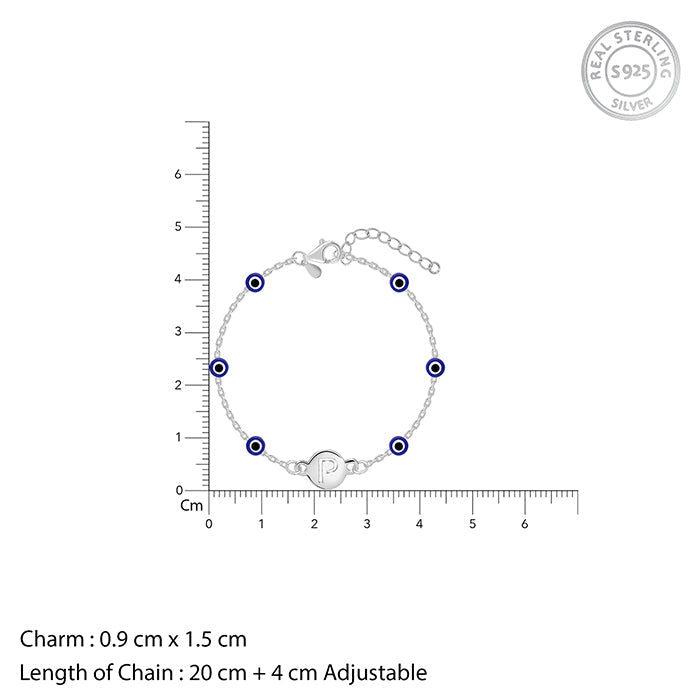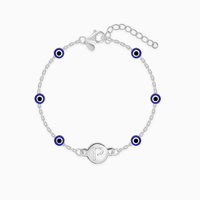 This silver personalised bracelet for women features a circular motif engraved with an initial of your choice. An evil eye motif is placed throughout the band.