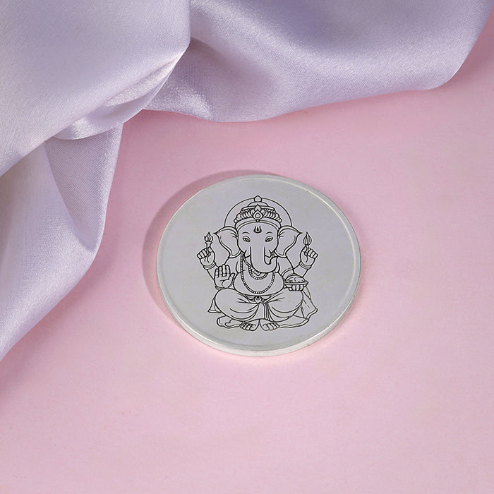 This personalised silver coin features an engraving of Lord Ganpati on one side. Add your message (Characters- 50) on the other side—perfect for gifting or marking a special occasion.