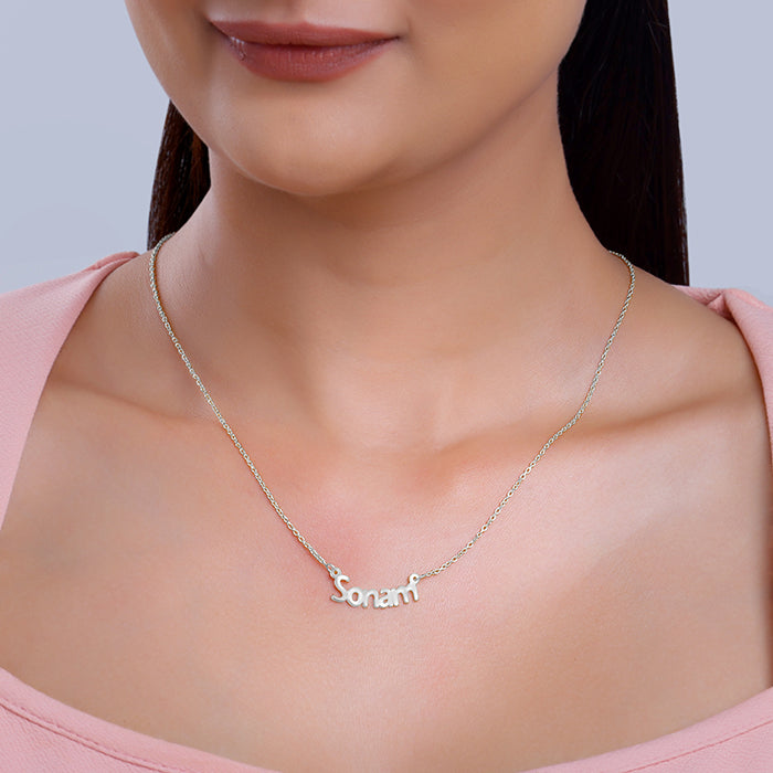 This silver personalised necklace for women features the name of your choice with the letters fused together.