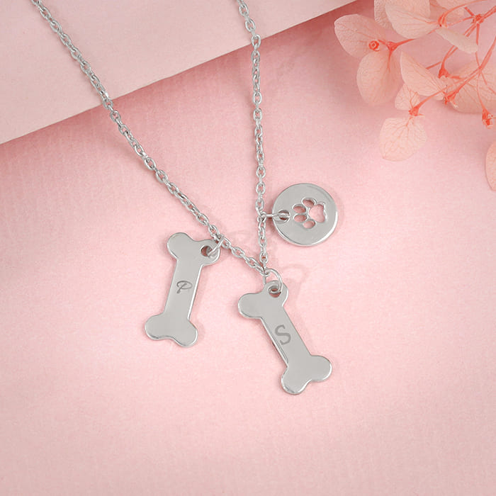 This silver personalised initial necklace for women features two dog-bone motifs and a circular charm motif with a dog paw print on it. Each dog bone motif has initials of your choice on them.
