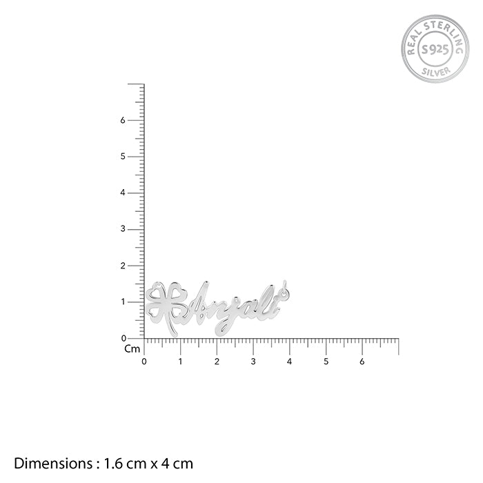 This silver custom name necklace features a dainty clover charm fused seamlessly with your chosen name—in this case,