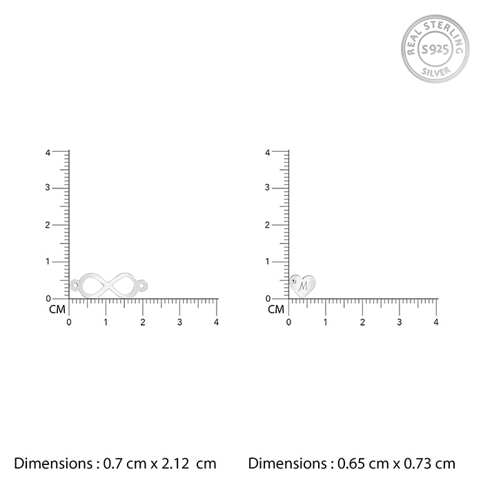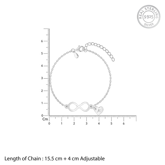 This silver personalised bracelet for women features an infinity design. A cute heart charm adds a touch of romance, with space to personalise it with any initial of your choice.