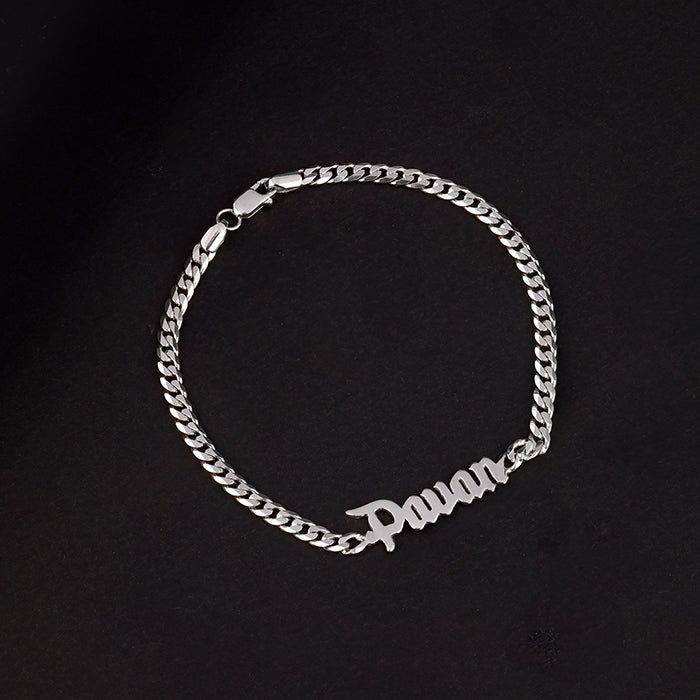 This personalised silver bracelet for men features a classic cuban link chain paired with a striking nameplate. Whether it’s your name, a nickname, or a word that means something to you—it’s engraved in clean, confident lettering that stands out without trying too hard. Designed with a secure clasp and comfortable length, this custom name bracelet for men is built for everyday wear.