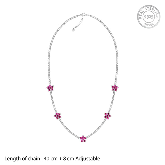 This silver necklace features five flower motifs, each adorned with pink-coloured stones, while the chain is studded with zircons.
