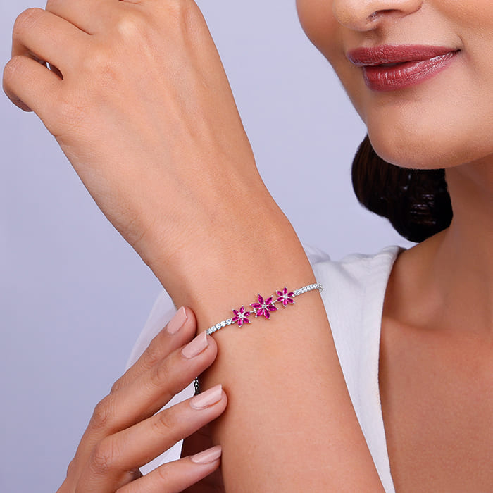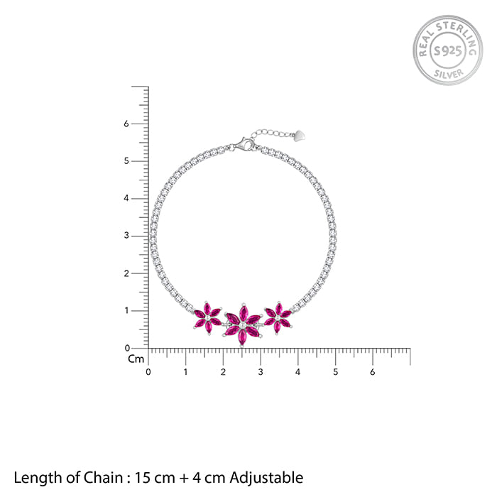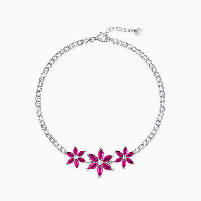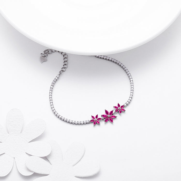 This silver tennis bracelet features three flower motifs, each adorned with a pink-coloured stone, while the chain is studded with zircons.