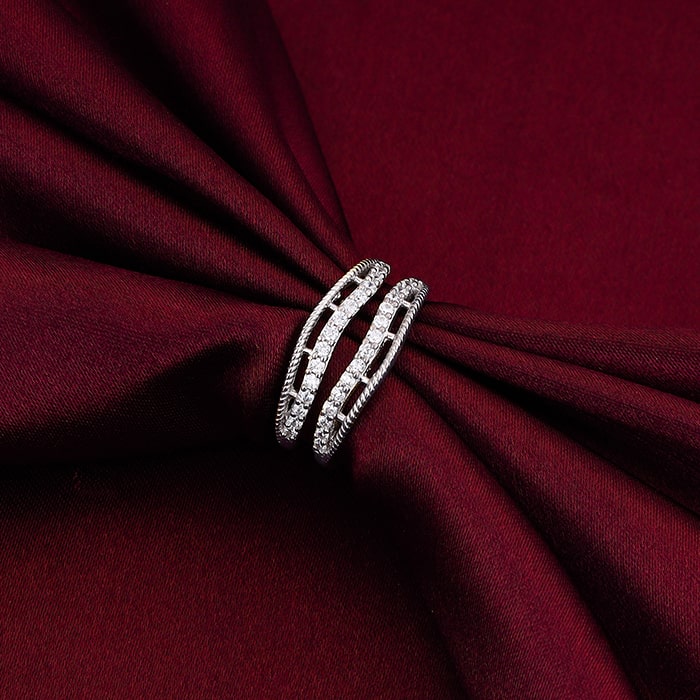 This silver faux stack ring has two channels with one studded with zircons. They have a slight minimal wave design.