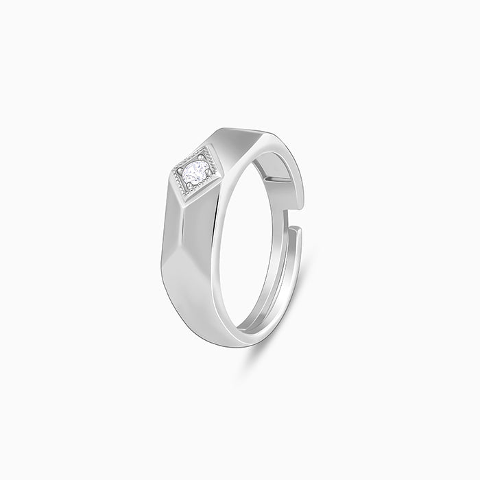 This silver ring for men features an angular, geometric design. A single circular zircon is set within a diamond-shaped bezel at the centre.