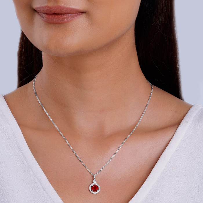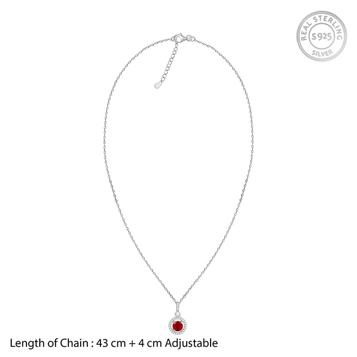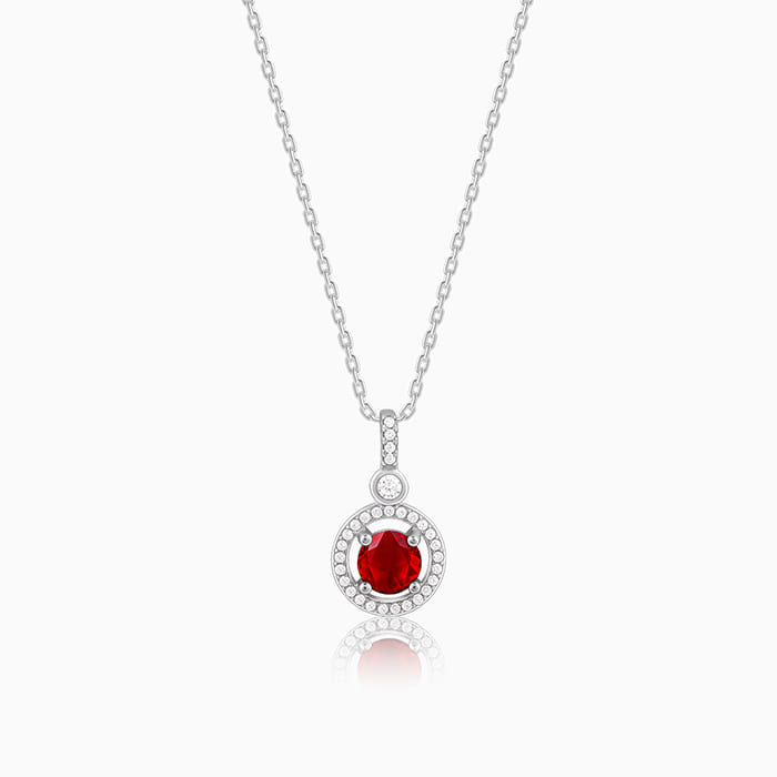 This silver pendant features a circle motif with zircons studded around and a red-coloured stone placed at the centre.