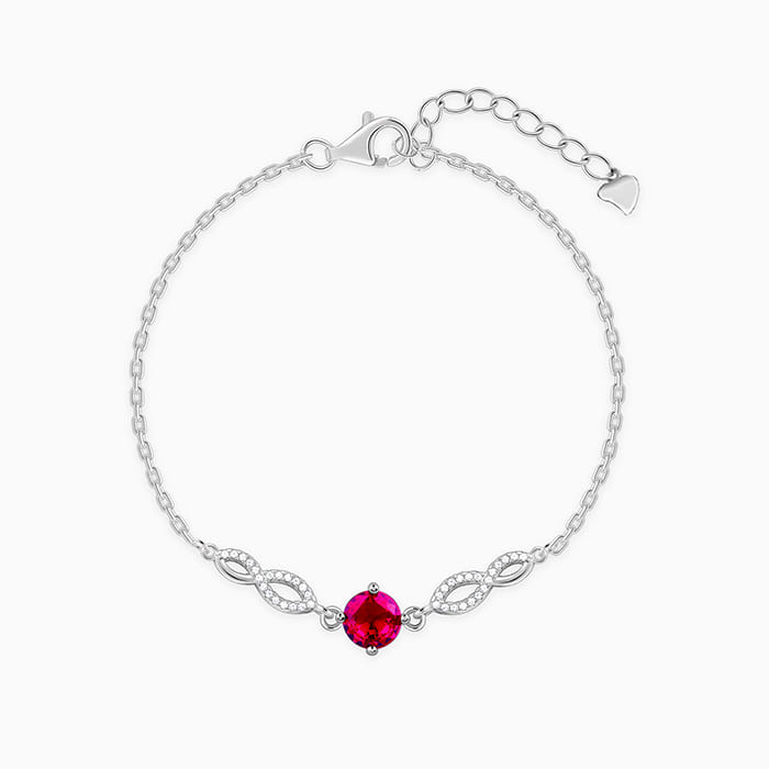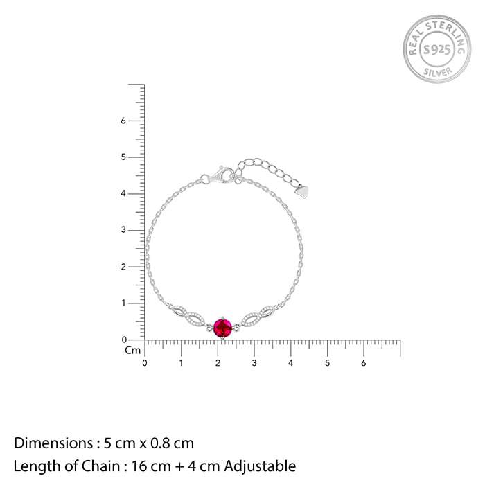 This silver bracelet features an infinity motif with zircons on both sides and a red-coloured stone at the centre.