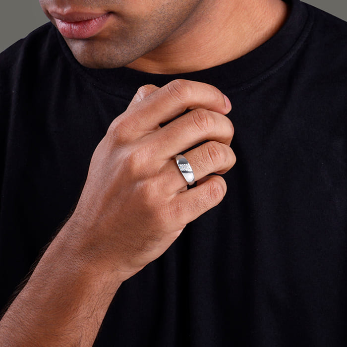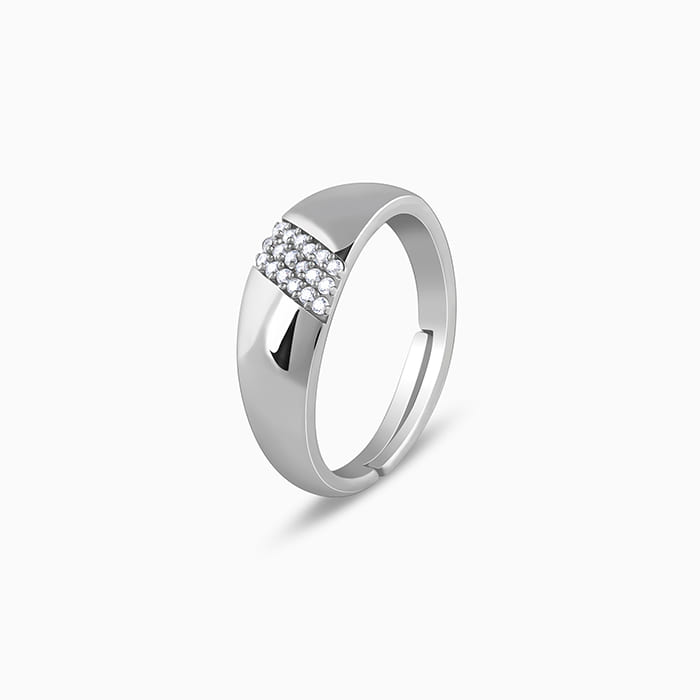 This silver mens ring features an adjustable design with a diagonal strip on thick flat band, embedded with zircons.