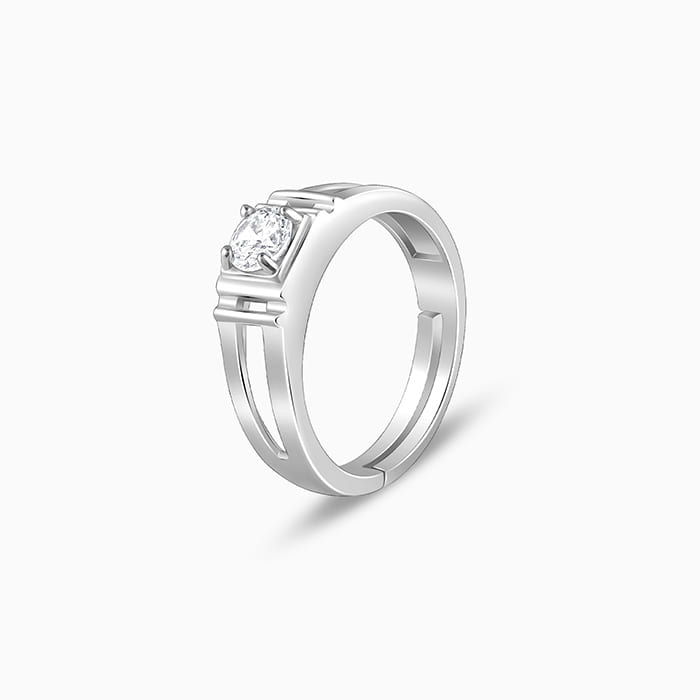 This silver ring for men features an adjustable design with a single round-cut zircon set in a bezel-style square mount. The band has a split-shank design with open gaps on either side of the central zircon.