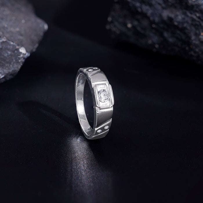 This silver mens ring features a single round zircon set in a bold rectangular bezel. Angular grooves and side detailing add a modern, minimal look.