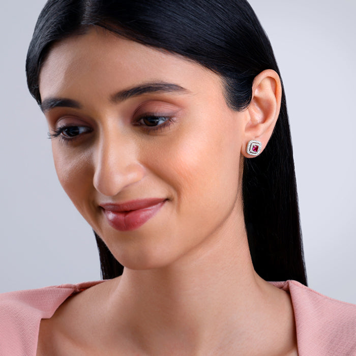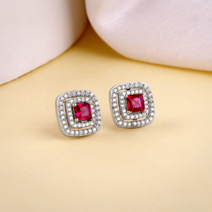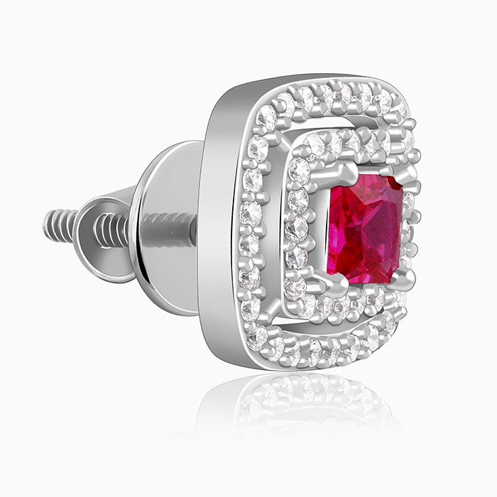 These womens silver earrings have a square shape each. Two rows of zircons gracefully line a square red coloured stone.