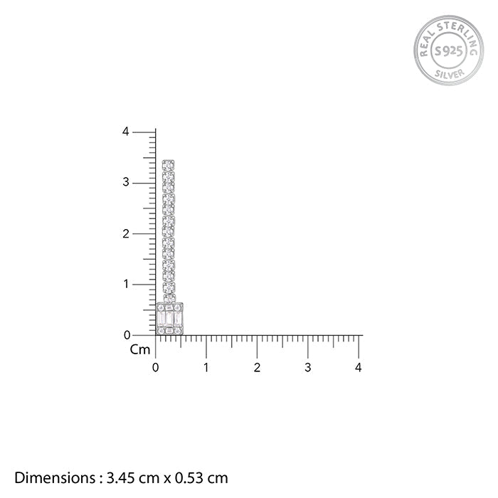 These silver earrings for women feature a graceful vertical row of circular zircons connected to a square baguette-cut zircon.