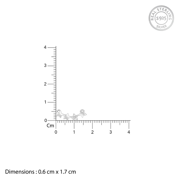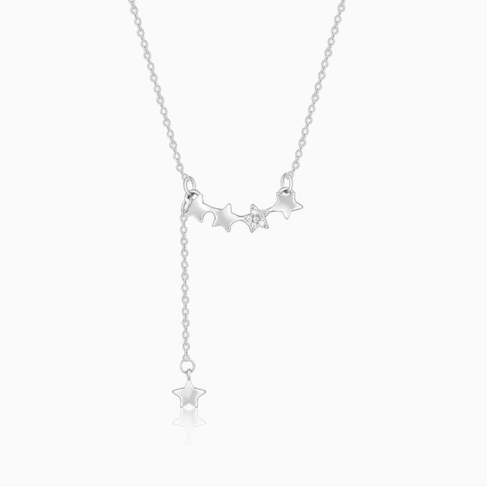 This silver necklace features a central motif of four stars, one of which is studded with zircons. There's a dangling chain with an additional star.