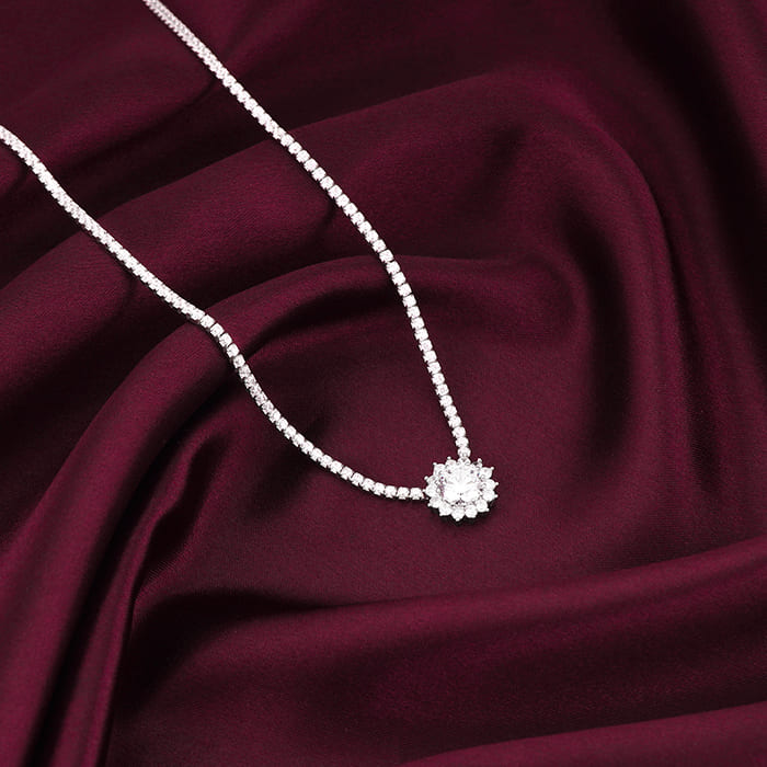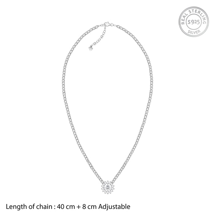 This silver necklace has a flower motif set with zircons in the centre of a zircon studded chain.