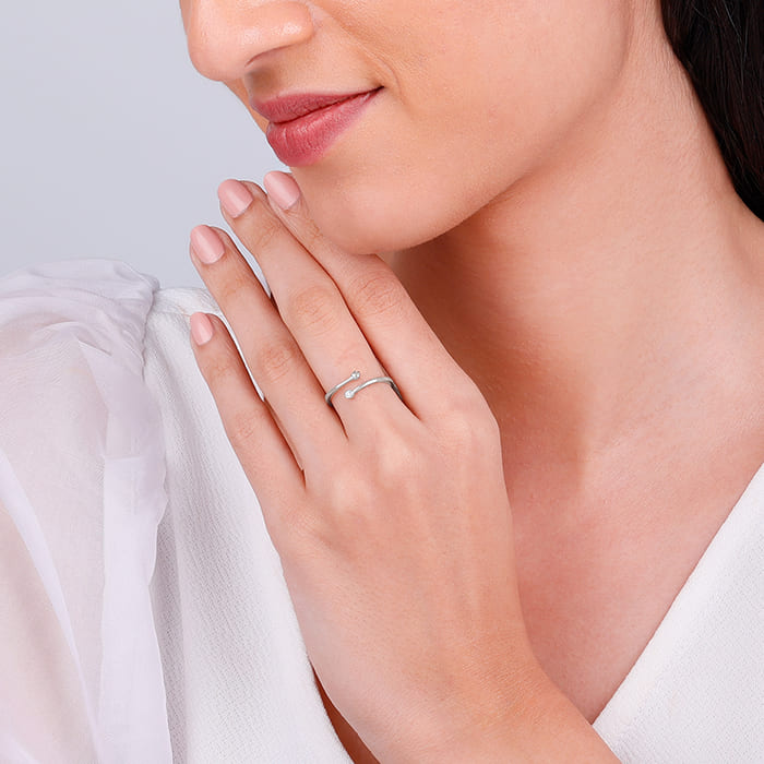 This minimal silver open ring features a plain star motif on one end and a charming circle zircon placed on the other.