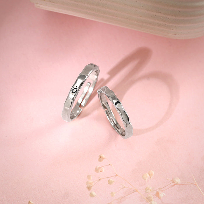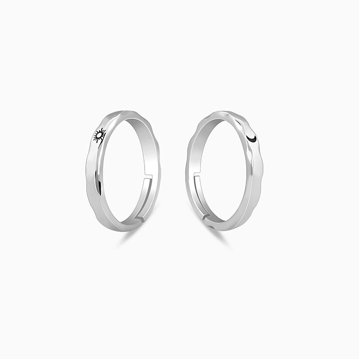 These silver couple bands feature a classic wave-like design. The male band features a sun motif engraved at the centre, while the female band has a moon.