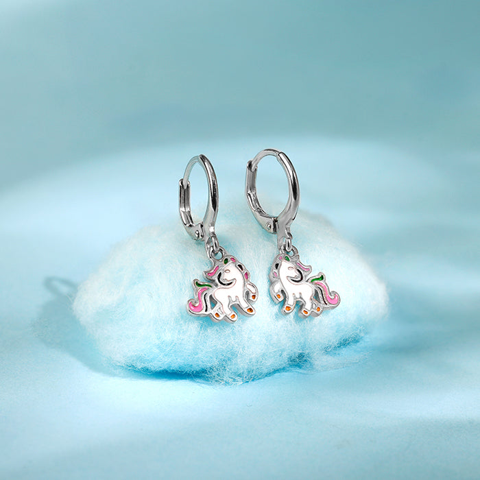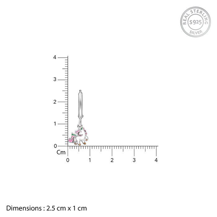 These silver hoop earrings for kids feature a dangling unicorn motif with colourful enamel.