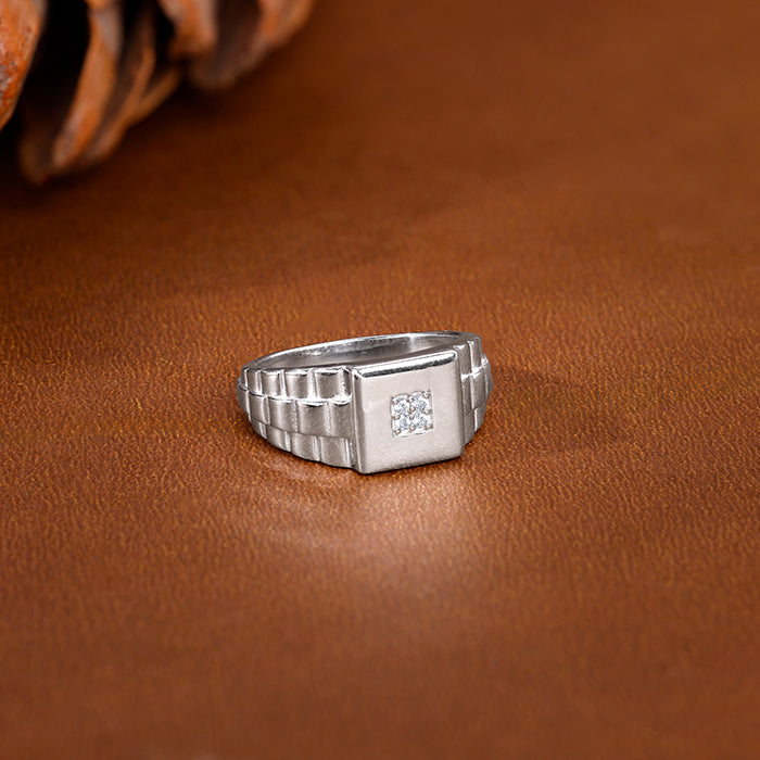 This silver mens ring features a geometric, block-like textured pattern on the sides. At the centre, a striking square design is studded with zircons.