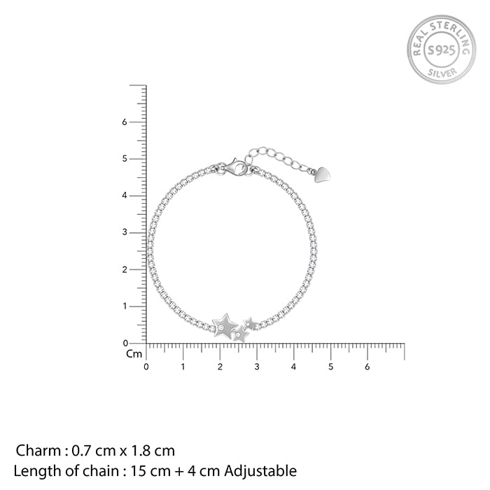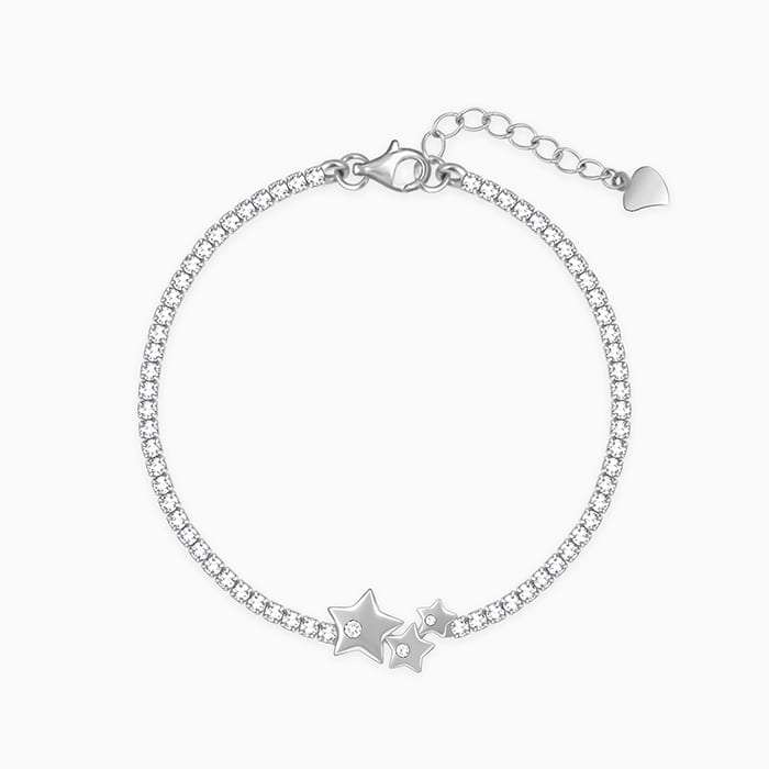 This silver tennis bracelet features triple star motif with zircons placed on top, and the chain is studded with zircons.