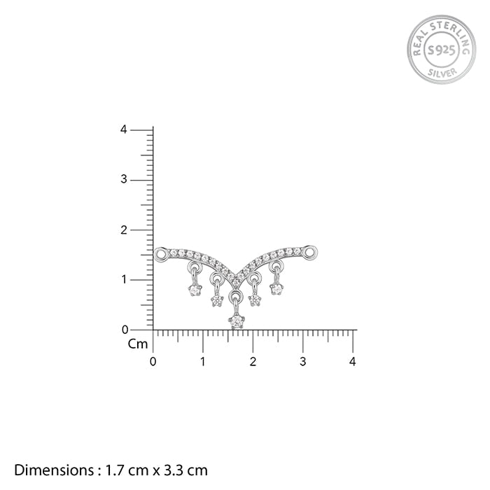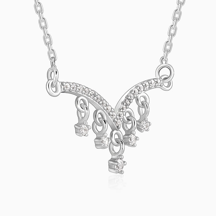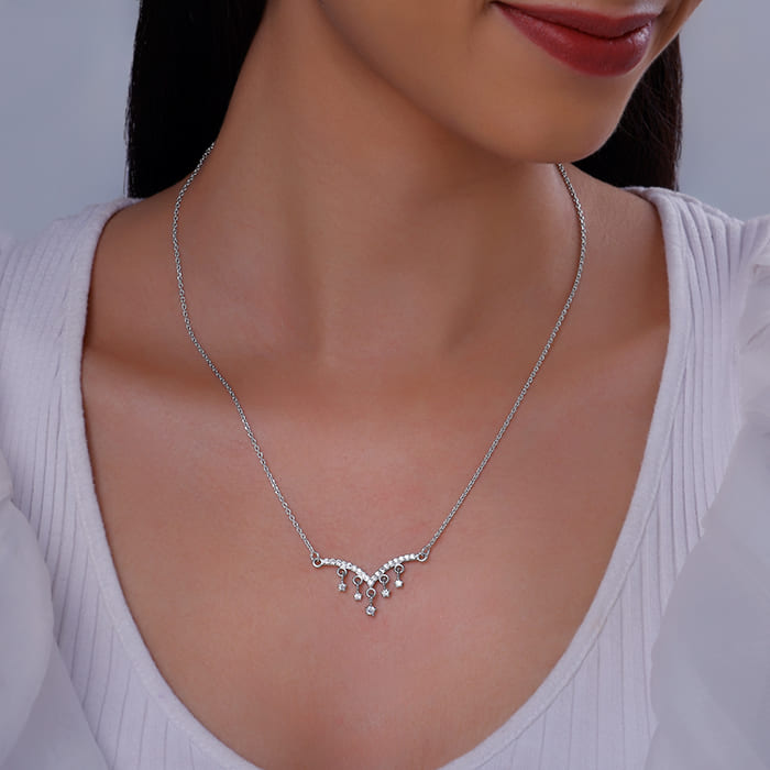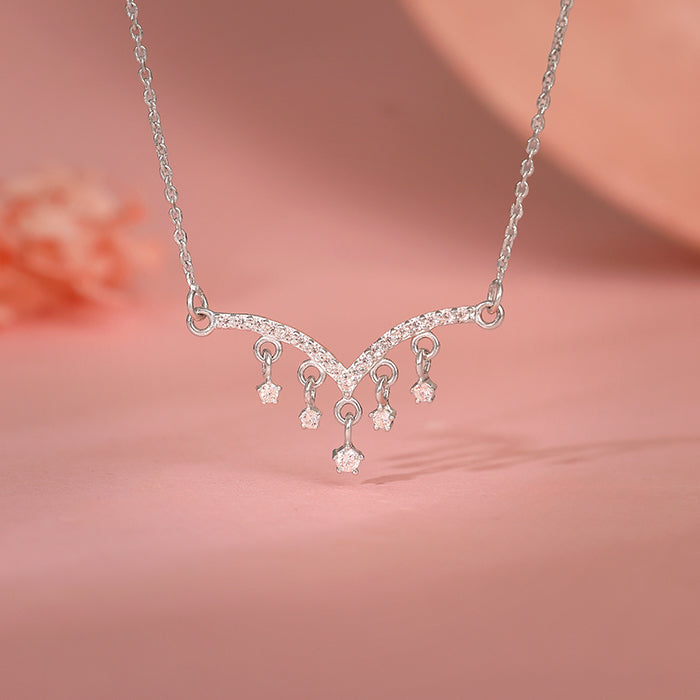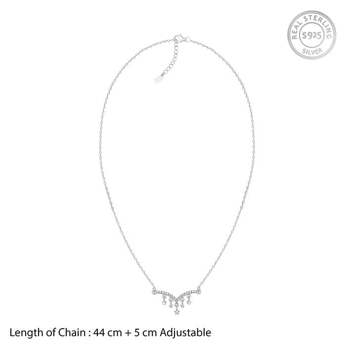This silver necklace features a v-shape design studded with zircons and stars dangling below, each studded with a zircon.