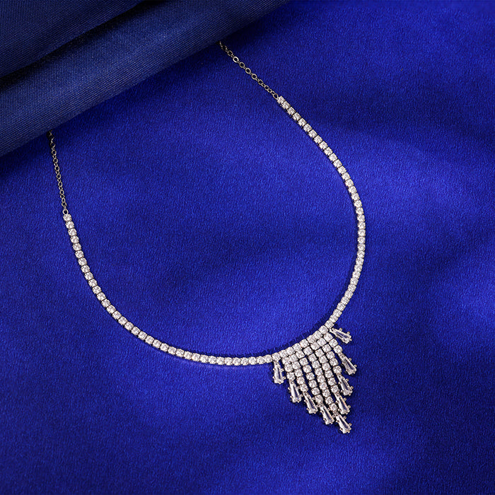 This silver necklace for women features a central fringe design, composed of multiple individual strands of zircons. These strands vary in length, creating a graceful cascading effect with the longest drops at the centre, fanning out shorter to the sides.